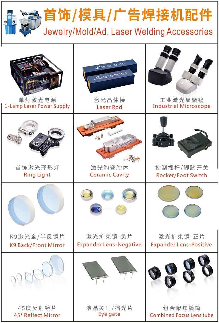 Spares for Jewelry laser welding machine Mould laser welding machine Ad laser welding machine -Laser power supply -Nd:YAG laser rod -Industrial laser microscope -Jewelry welding ring light -Ceramic cavity -Rocker / Foot switch -K9 front /...