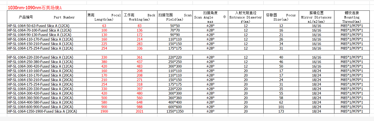 Quartz Laser F-Theta Lens 1064nm. Material: Fused Silica-A Wavelength: 1030nm~1090nm Focal length: 210mm Scan field: 150x150mm Entrance Dia.: 20mm Mounting thread: M85*1/M79*1 *More specifications are optional as showed in following pic*...