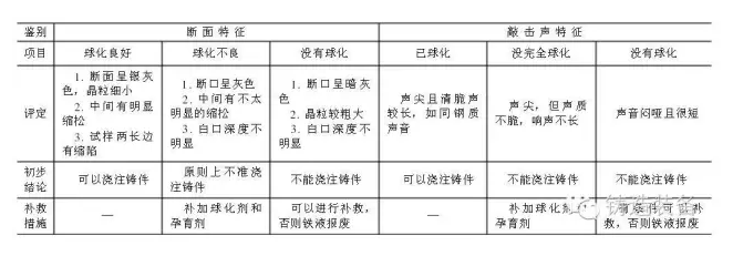 球處理完畢后,用樣勺澆注一塊厚10mm左右的試塊,冷卻至暗紅色,淬火擊斷后,如發(fā)現(xiàn)試塊上表面有一道黑邊,則表示球化不良,且黑邊越厚,球化越差,產(chǎn)生衰退,此時如鐵液溫度高可補加合金。從試塊上還可看出:如試塊周圍成圓弧狀,并中間凹陷,有的還有一道道皺紋,則也表示球化良好;如試塊上表面有麥皮狀的點,則表示鐵液氧化,易于衰退。在這種情況下,應(yīng)對爐子進行改造。