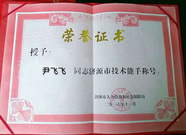 我公司尹飛飛獲得“濟(jì)源市技術(shù)能手”光榮稱號(hào)