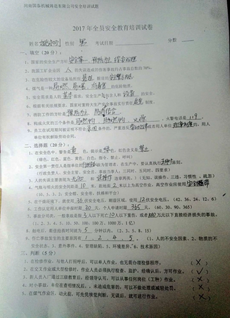 近日,公司生產(chǎn)運營部組織全體員工進行安全教育培訓,培訓采用閉卷考試的方式,由員工統(tǒng)一填寫。