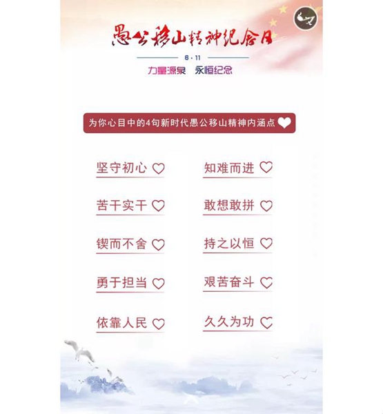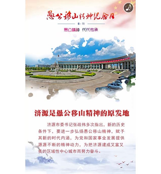 愚公移山精神是中華民族的寶貴精神財(cái)富,是黨和人民事業(yè)永續(xù)發(fā)展的力量源泉,受到黨和國家領(lǐng)導(dǎo)人的高度重視,成為中國精神、民族精神的代表。2017年濟(jì)源將每年的6月11日設(shè)立為“愚公移山精神紀(jì)念日”,旨在線進(jìn)一步傳承中華民族精神。