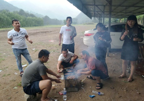 王屋林山,山清水秀,空氣清新。大家一邊欣賞美麗,一邊開始野炊前的準備工作。洗菜、切菜、穿串、生火、烤制,加上車間為大家準備的水果、飲料和啤酒,臨近中午,盛宴出爐,香飄四溢。